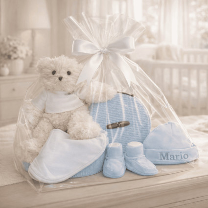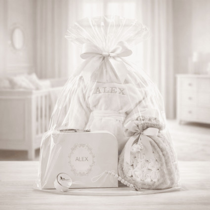 Bestickter Bademantel, Musselin und Bärenplüsch ANPASSBAR C320 105,18 € (15 noten) Ein Korb voller Zärtlichkeit, bestehend aus einem Plüschteddybär, einem Set aus Musselintüchern und einem Bademantel, der mit dem Namen des Babys bestickt ist. In den Warenkorb